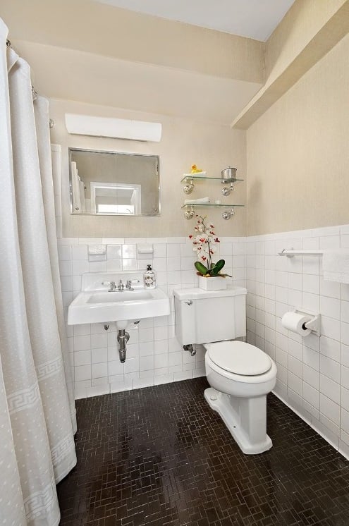 Said bathroom looks to be in good condition, with a clean-looking pedestal sink, some shelving above the toilet (essential since there isn’t any storage space beneath the sink), and pristine-looking white tiles along the walls. The flooring seems a bit too dark for the space. If budget allows, it could stand to be updated.