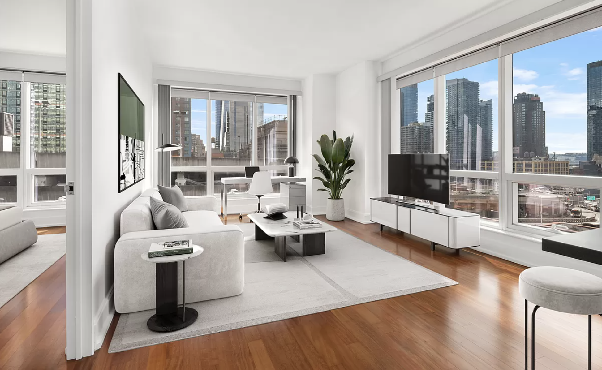 Designed by Pritzker Prize-winning architect Aìlvaro Siza, 611 West 56th St. opened in 2021. The 35-story tower has 77 units, an outdoor garden mezzanine, entertaining lounge, a fitness center, media/games room, and playroom. Listed for $1.3 million, the least expensive unit has one bedroom, one full bath, and one half bath. It is 860 square feet.