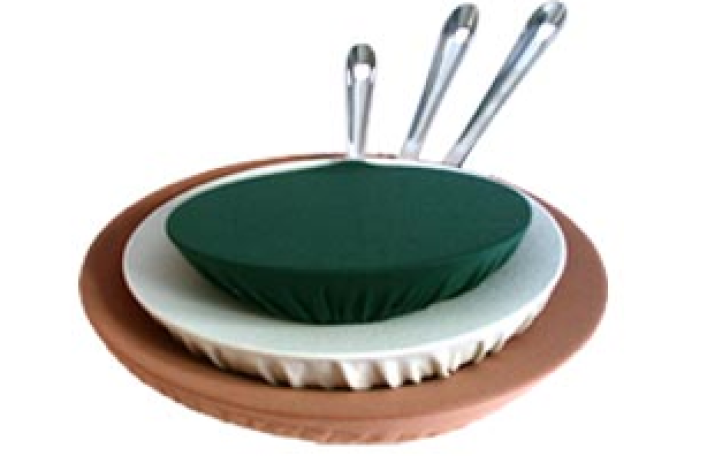 EnterProtect-a Pan, a one-size-fits-all, machine-washable cotton cover for pots and pans that is supposed to protect surfaces from scratches, dust and fingerprints. It looks something like a very stretchable beret with an elastic bottom that fits snugly over the top of a pan like a cover, or around its bottom like a coaster.
