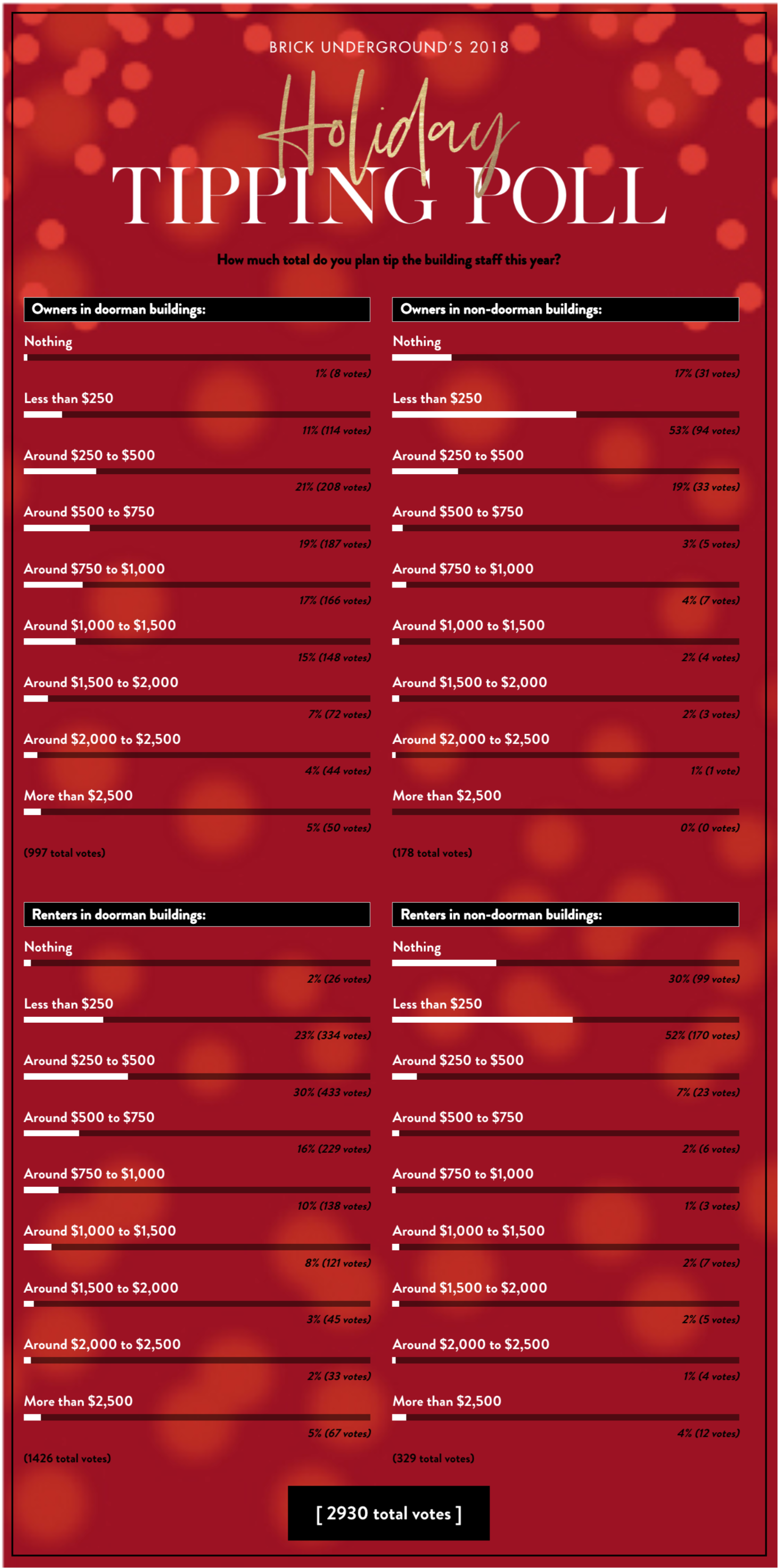 In Brick Underground's Naughty vs. Nice Holiday Tipping Poll, 65 percent of nearly 600 voters with "bad" doormen said they still planned to tip them, usually in the range of $25-$50 apiece. As for those with delinquent supers, only 49 percent of the 455 respondents planned to give them some extra cash. Those who did were clustered in the lower end of the $25-$100 range.