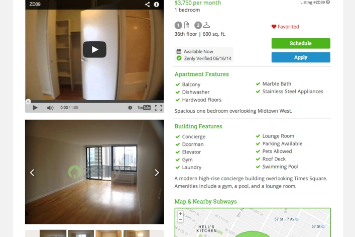 Launched earlier this month, Zenly hears about available apartments directly from landlords and property managers--meaning you won’t find duplicate listings, reposted Craigslist ads or brokers doing the bait-and-switch, as we observed firsthand in a test-run of the beta site--and then sends a company rep to film and photograph the apartment. Each listing comes with an accurate write-up and a video walk-through, and when you’re ready to see a place in the flesh, you can schedule an appointment through the website, which will set it up with the landlord.