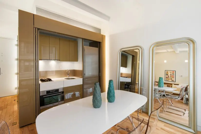 This $795,000 studio at 20 East 9th Street has distinct areas for sleeping, lounging, dining, cooking, working and bathing—all made even more practical thanks to a plethora of creative built-ins, including a Murphy bed with individual reading lights and a headboard that prevents pillows from slipping behind the mattress, tons of cabinets and shelves, and a TV concealed behind a sliding panel on the wall.