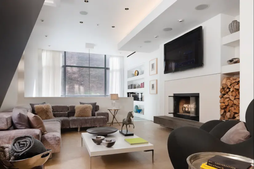 On the parlor floor, the living room is similarly light and airy, but also made homey by a woodburning fireplace and library nook above, which overlooks the garden.