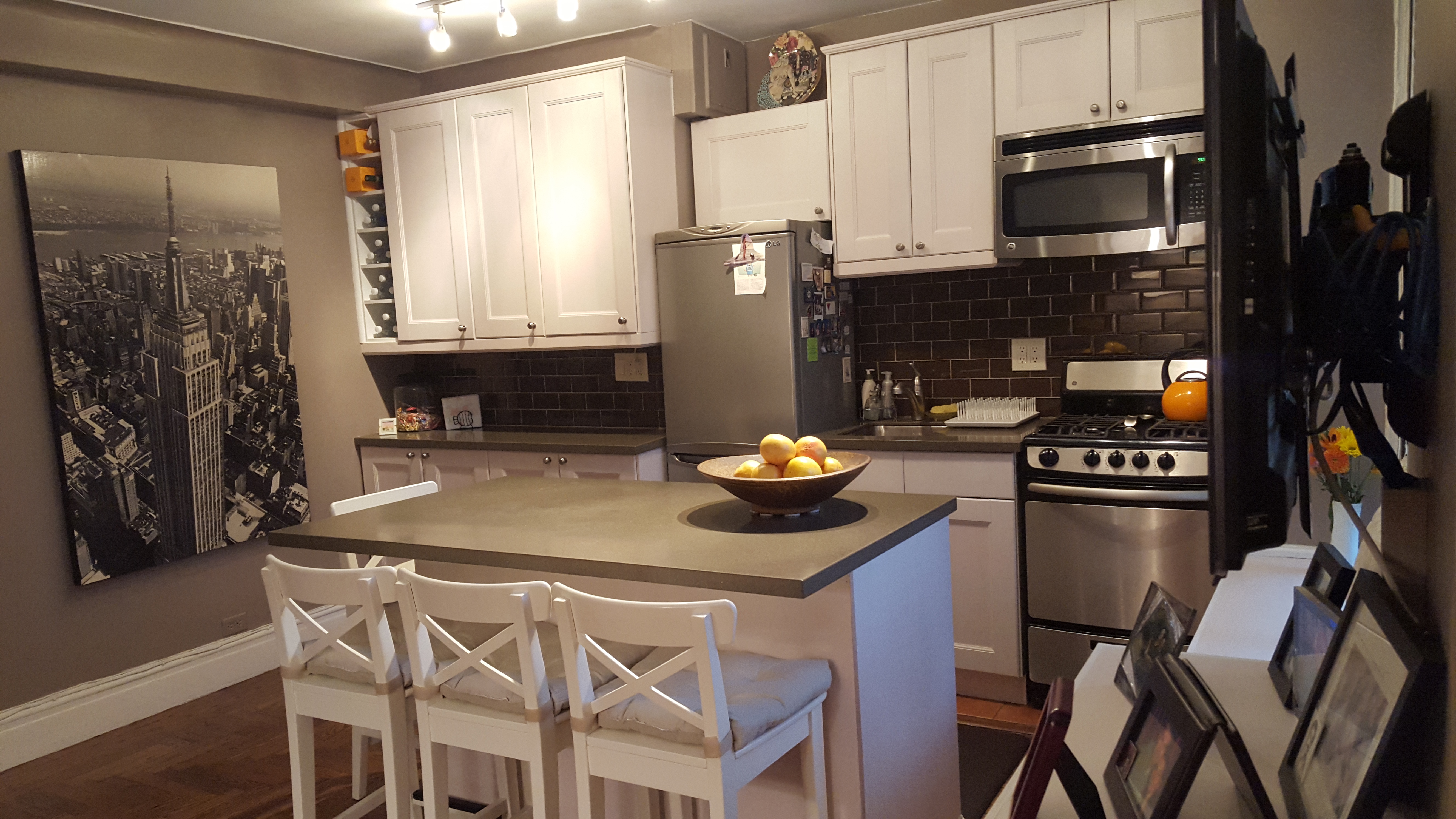 I love that I can have people over now. The kitchen was small with an old fridge and a small cabinet -- I gutted it and made beautiful cabinets. I wanted to increase the space in case I ever sell it. It's got an open concept kitchen and living room (see below).
