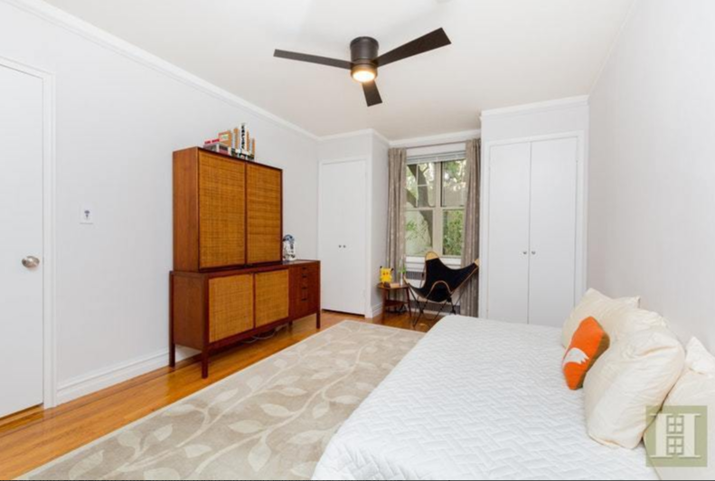 The master bedroom, according to the listing, has views of Fort Tryon Park, home of the Cloisters, and also has an en-suite bathroom with a shower.
