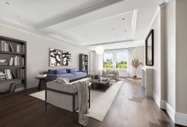 The interiors evoke a museum, almost overwhelming in their level of detail: ceiling frescos resemble family crests of the Middle Ages, and sculpted wood reliefs along the walls and stone fireplace further contribute to the aura of history. Dark cherry and mahogany bring a heavy, Game of Thrones style to the home--it would take a big personality to fill the space.