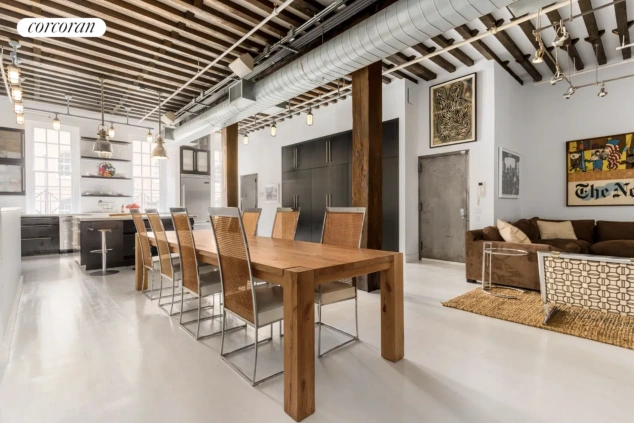 Listed for $6.5 million, this 2,800-square-foot, two-bedroom, two-bath loft features a 1,300-square-foot great room with soaring ceilings and an adjoining state-of-the-art kitchen with custom cabinetry, marble countertops, and an extended dining bar. The private elevator opens onto two hallways, each leading to a private bedroom suite at opposiite ends of the floor plan. Original details include wooden columns, brick walls, and pressed-tin ceilings, while wide-plank white oak floors and a Lutron lighting and shade system are modern updates. The cast-iron, circa-1910 building has six units on six stories. The monthly common charge is $4,800.
