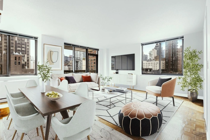 Apartments on the Upper East Side are a solid investment and a top pick for empty nesters wanting a Manhattan neighborhood with a residential feel that's still close to the action. This apartment, 403 East 62nd St., #11/12D, is a corner duplex in a full-service condo. Although the interior looks tired (when you look at the non-virtually staged photos) and the parquet floor could probably be refinished, the apartment has a few things going for it: two bathrooms, plenty of closet space, balconies off both the living room, and master bedroom and some flexibility in the layout.