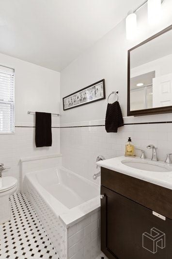 The corner master bedroom has his-and-her closets, and the bathroom has a separate tub and standing shower, as well as a window.
