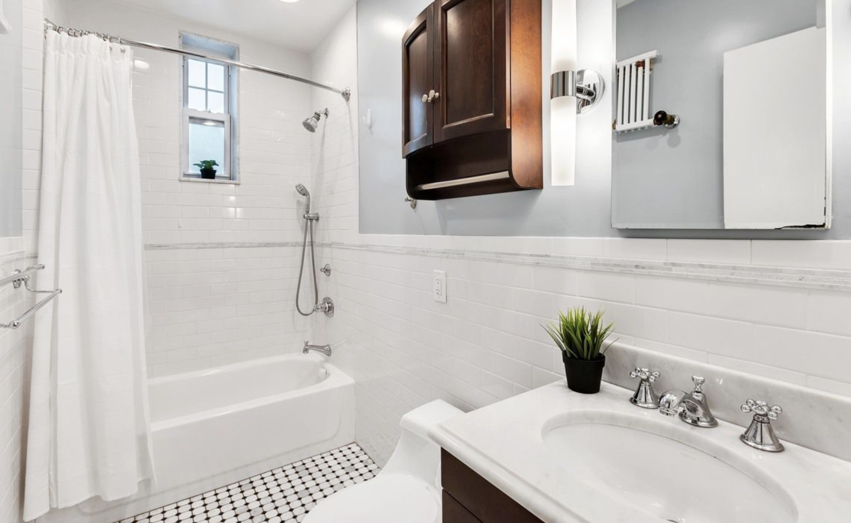 The apartment has two bathrooms; the master bath is also renovated and features subway tile.