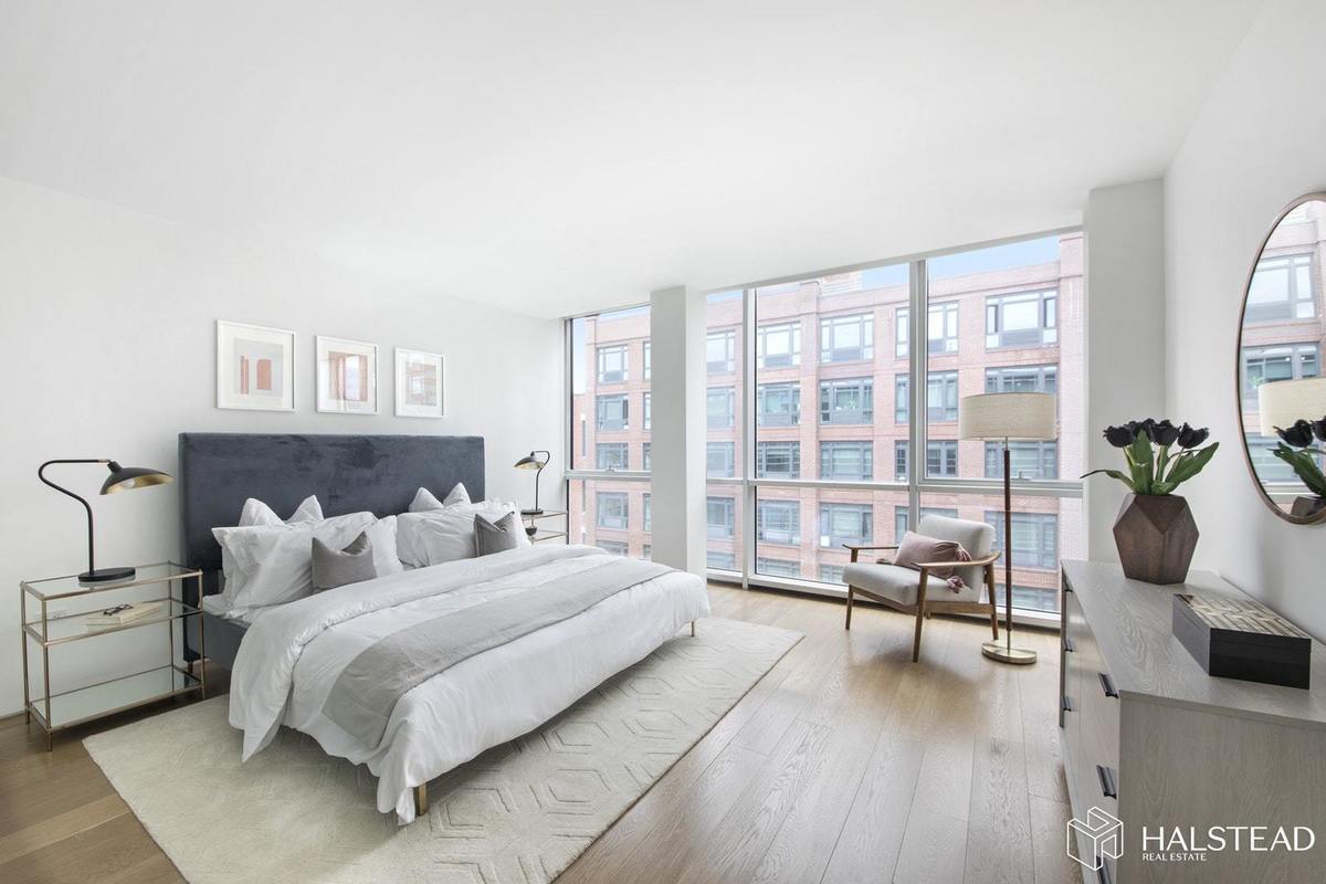 Building amenities include a common garden, windowed gym with two Peloton bikes, and an attended lobby with 14-foot ceilings. There are 15 apartments.