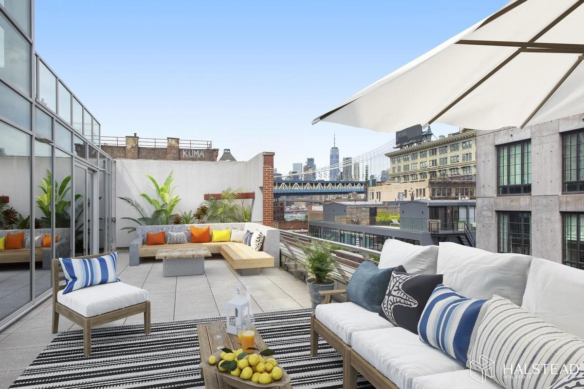 But what you see on the outside is not always an indication of what you get on the inside. This is a three-bedroom, three-bath condo with a huge layout of 2,552 square feet. There’s a great room with beamed ceilings and Siberian wide-plank flooring, and an 800-square-foot terrace with views of the East River, Manhattan Bridge, and Lower Manhattan.