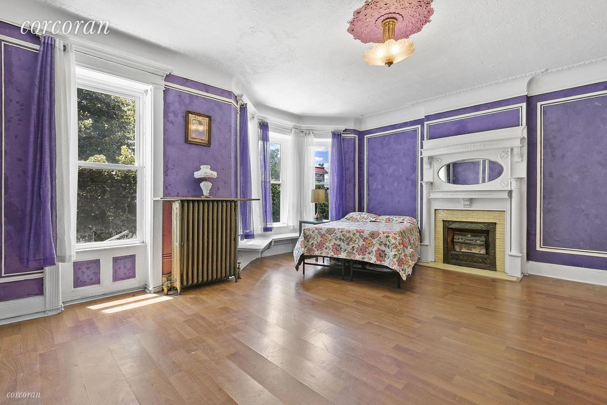 Judging by the listing photos, the previous owners made some bold color choices from room to room, but it's nothing a paint job won't fix if it isn't to the buyer's liking. On the first floor, the lime-colored living room (see the top photo) features a wood-burning fireplace, built-in shelves, and eye-catching millwork. The adjacent dining room gets natural light through large windows. The kitchen looks fairly modern, with plentiful storage and an island for extra dining space.