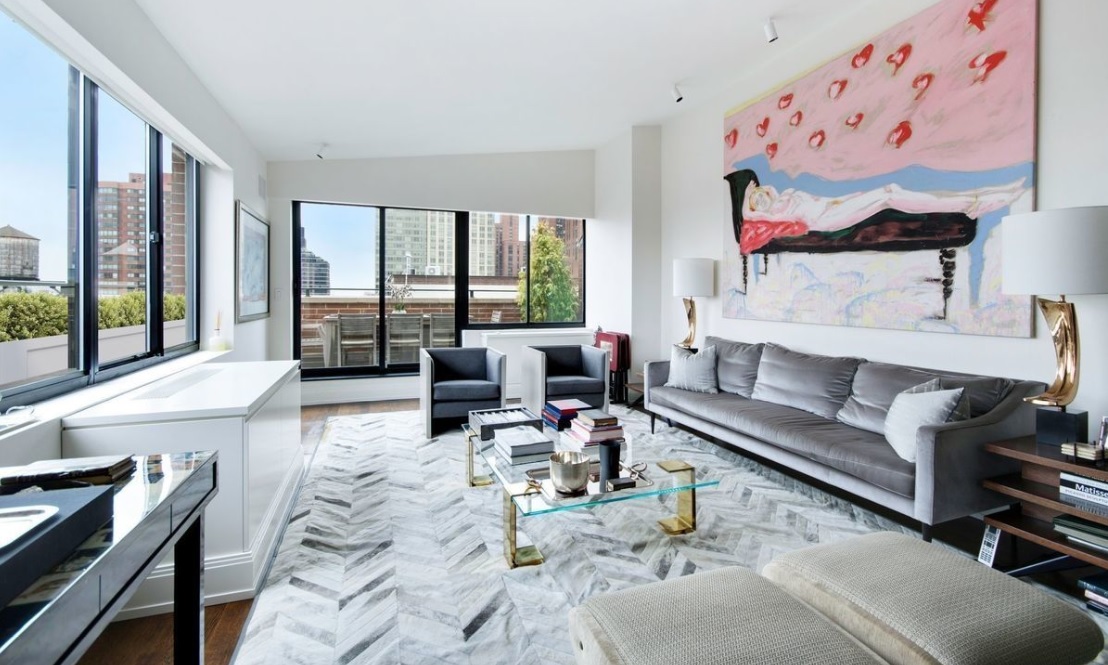 Following a recent $355,000 price reduction, this 1,735-square-foot, three-bedroom, three-bath condo is now listed for $3,995,000. The unit has two terraces, including one that wraps around the first floor of this duplex, a chef’s kitchen with a marble island, a formal dining area, vaulted ceilings, a wood-burning fireplace, and in-unit laundry. The apartment is outfitted with Savant and Lutron smart home technology (for lighting, shades, and TV), and a Sonos sound system. It’s located in a pet-friendly full-service condo building with a full-time doorman and staff, a fitness center, a communal garden, storage, and a bike room. Common charges are $2,721 a month. Taxes are $2,832 a month.