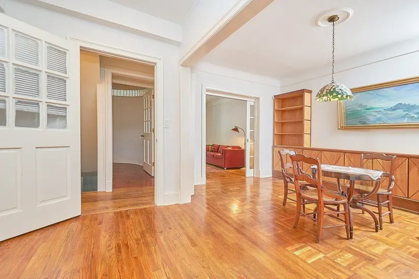 Located in the Marble Hill area, the 2,000-square-foot brick townhouse isn't much to look at on the outside, but inside are hardwood floors, ceiling medallions, moldings, pocket doors, skylights, crystal doorknobs, built-ins, arches and alcoves. We even like the (presumably partially original) mint green bathroom, even with its two-tone tile.