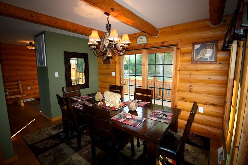 If any of that sounds appealing to you, consider this four-bedroom, three-and-a-half-bath log cabin at 251 East Ridge Dr., now on the market for $520,000. The house was built in 2008 and has a classic rustic feel, with hardwood floors and a spacious living room with vaulted ceilings, floor-to-ceiling windows, and a stone fireplace.