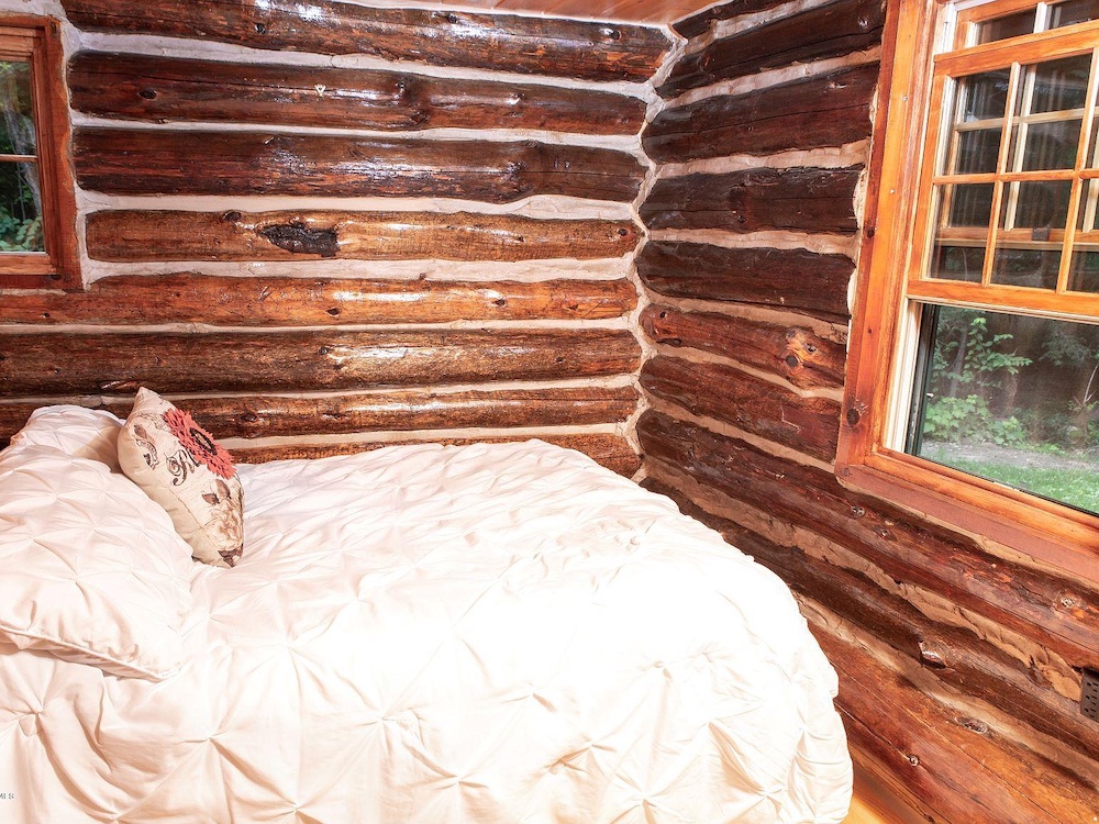 An additional bedroom has bunk beds and a more traditional log cabin aesthetic.