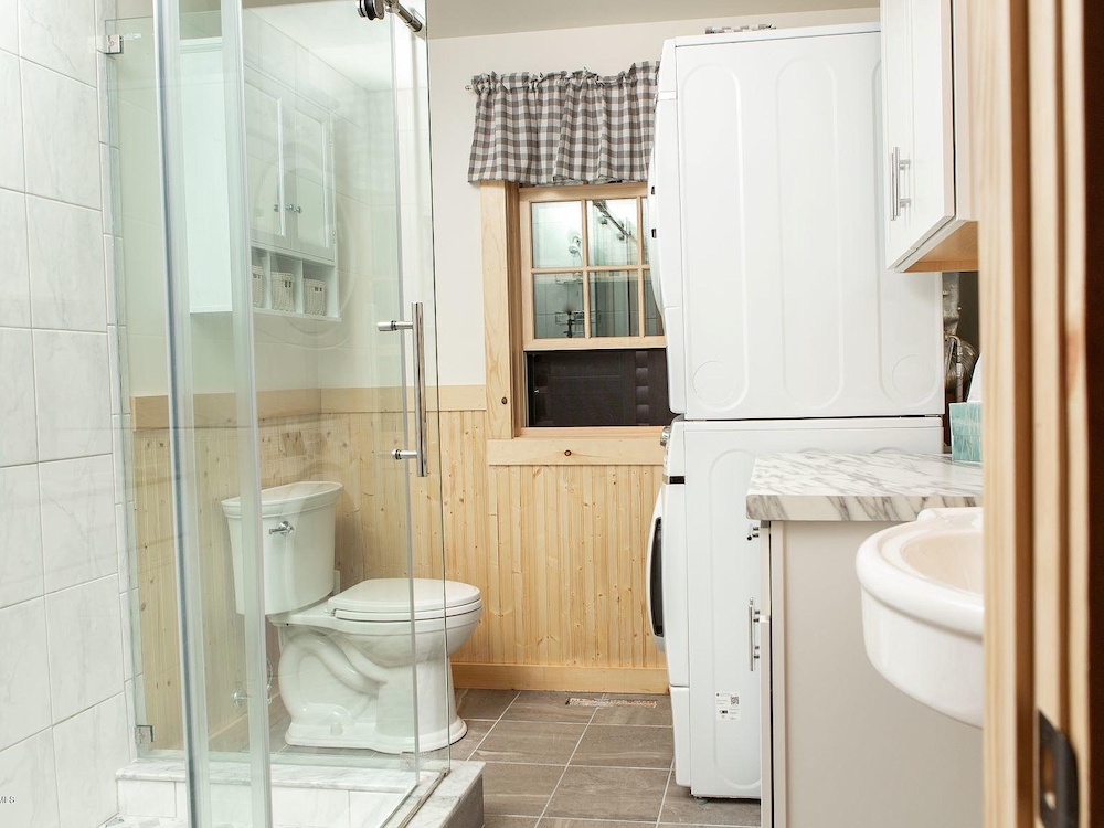 One of the baths has a glass-enclosed standing shower, in addition a washer/dryer.