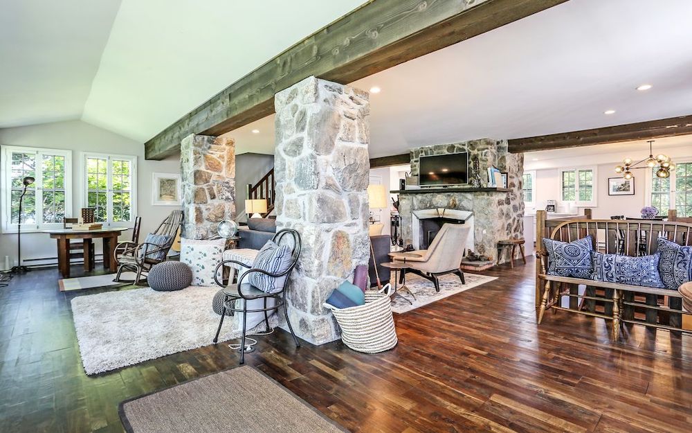The house has a window-lined great room, with hardwood floors, exposed wooden ceiling beams, and stone pillars.
