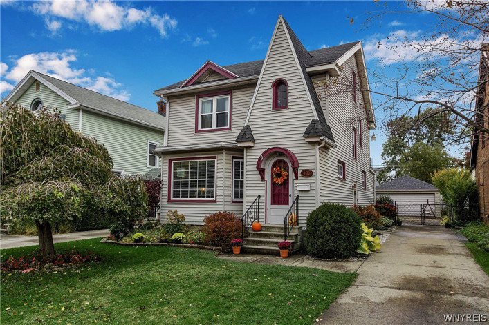 This three bedroom, one bath is listed for $245,000. It has a gas fireplace, built-ins, moldings, carpeted and hardwood floors, an updated kitchen with butcher block and stainless steel appliances, ceiling fans, a partially-finished basement, detached garage, porch, and patio. Delaware Park and the Buffalo Zoo are nearby.