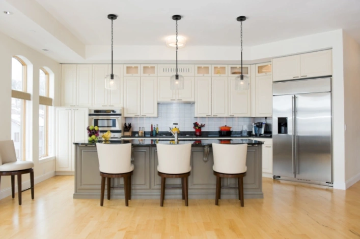 These Parkmont pendant lights by LumLight, shown here with matte black hardware and glass shades, are one of many fixtures offered with built-in SkyPlug installation technology.