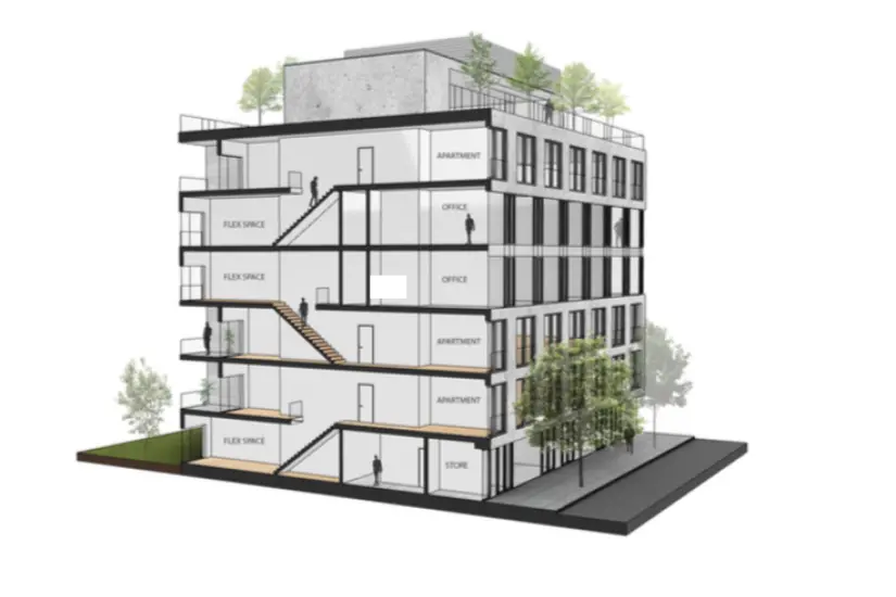 Katz Architecture's prototype for a new live/work building with ground-floor storefronts, apartments, and separate offices for residents.