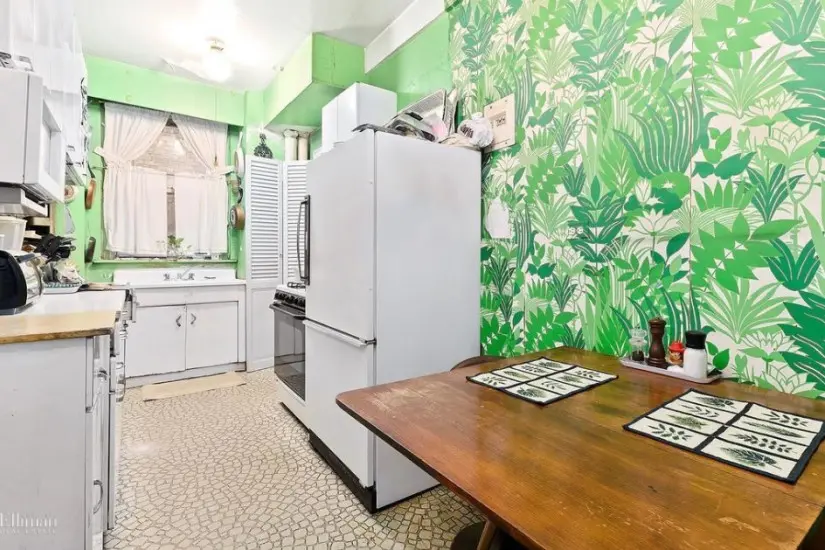 Welcome to the jungle: Architect Benjamin Andres would make the kitchen in this Upper West Side co-op smaller (and lose the wallpaper) to make room for a second full bathroom.