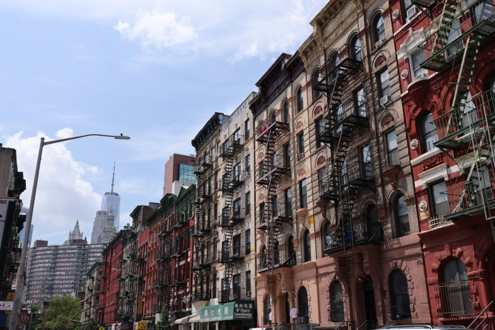 This is a photograph of brightly painted fire escapes on historic brick buildings in the Lower East Side of Manhattan.