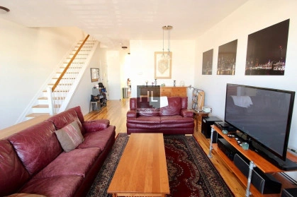 This apartment is a three bedroom, two-and-a-half bath duplex on Columbia Street in what is cumbersomely known as the Columbia Street Waterfront District. The building is three doors down from the beloved Thai restaurant Pok Pok, seven blocks from Brooklyn Bridge Park and the park's ferry terminal, with service to the Financial District, and eight mostly long blocks from the Bergen Street F and G station. It's also a short walk from the acoustic-music haven Jalopy, a bar, venue, and music school.