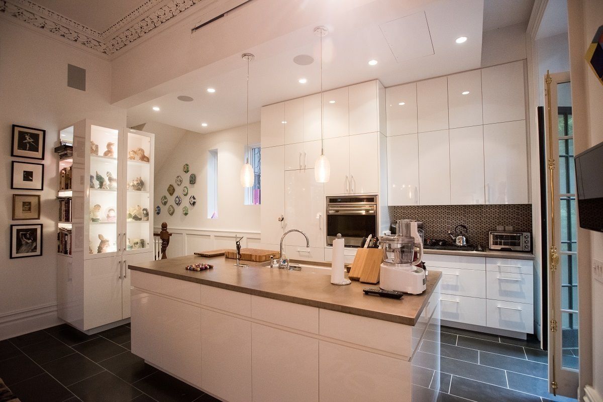 The apartment is one of 11 units in a townhouse rental building built in 1900. The triplex is a four bedroom, three-and-a-half bath that was recently renovated and includes a very contemporary kitchen, central air, and surround sound, juxtaposed with historic features like elaborate wainscoting and two working fireplaces, and occasionally, some wacky carpeting and wallpaper.