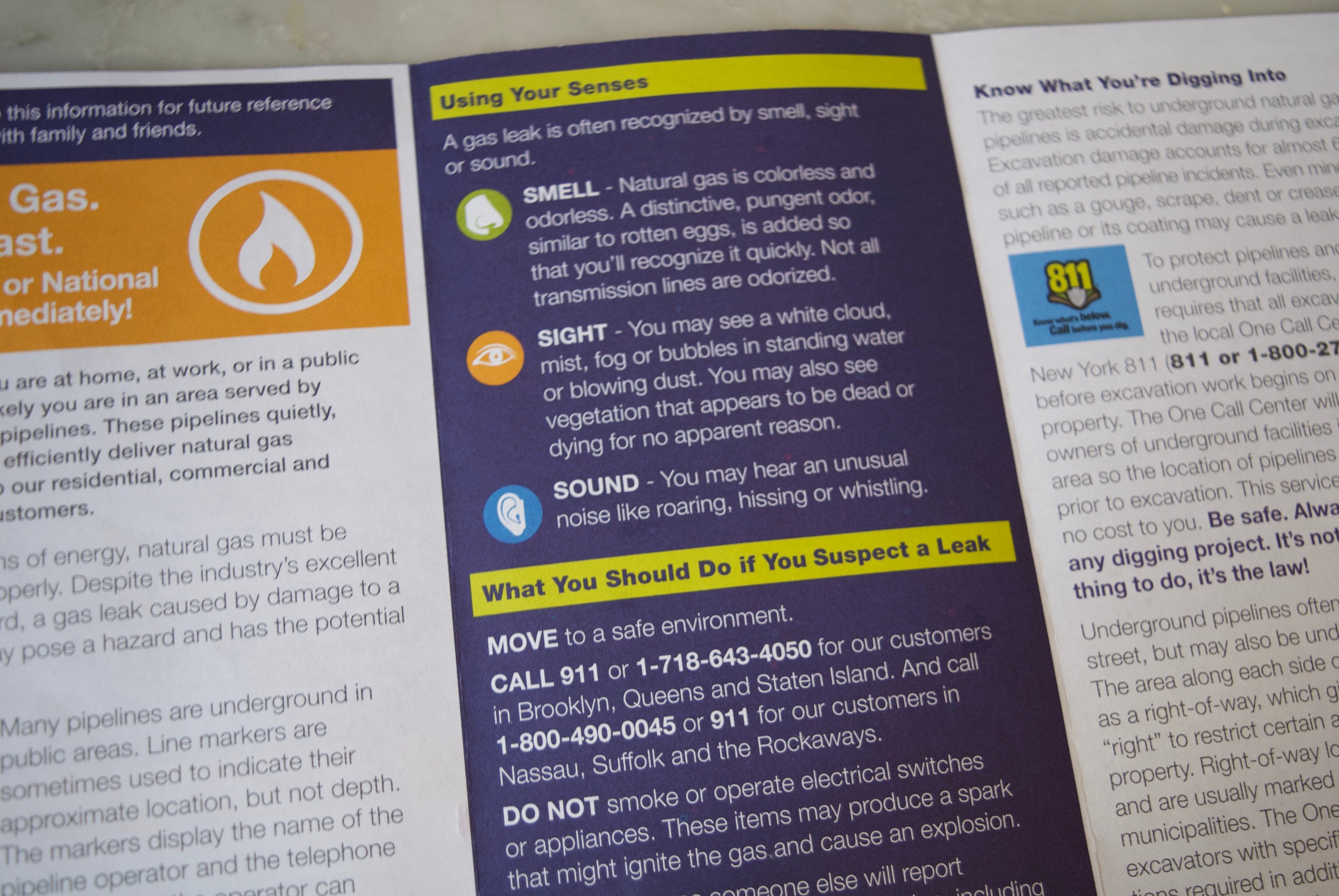 Then, on a Sunday morning in October, my husband was heading out with the kids and texted me to say our neighbor, AJ, was out on the street and said he could smell gas. I went down to chat with him. He told me he’d had a gas leak in his kitchen a few weeks ago, which had been fixed but he could still smell gas. His landlord sent a plumber, but they hadn’t been able to identify a leak. In the end, they recommended he call National Grid—who had just arrived.