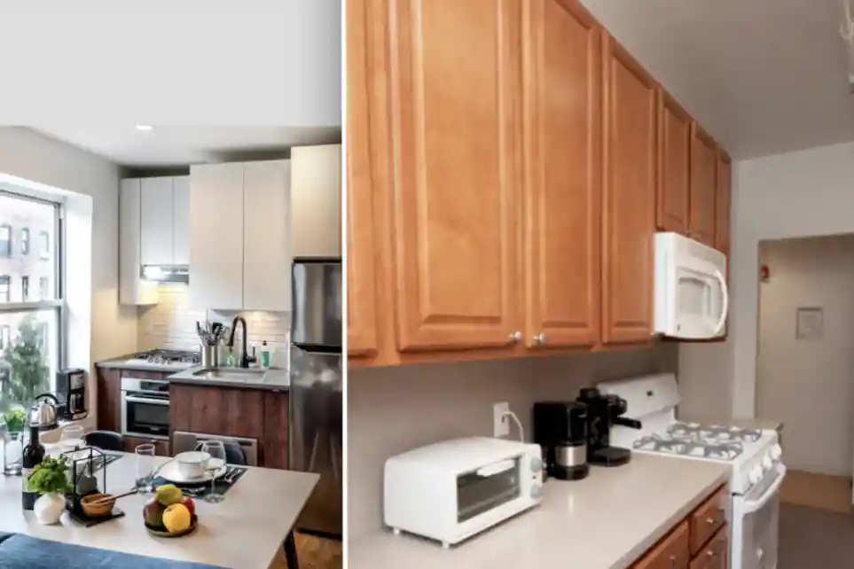 An apartment in Quarters' East Village location, left, and Columbia's apartment-style housing.