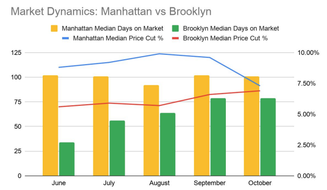 Both days on the market and price cuts are increasing in Brooklyn, suggesting buyers might be re-evaluating their options, the report notes. In Manhattan, it appears sellers are becoming increasingly realistic, with a steadier pace for days on market and deeper median price cuts.